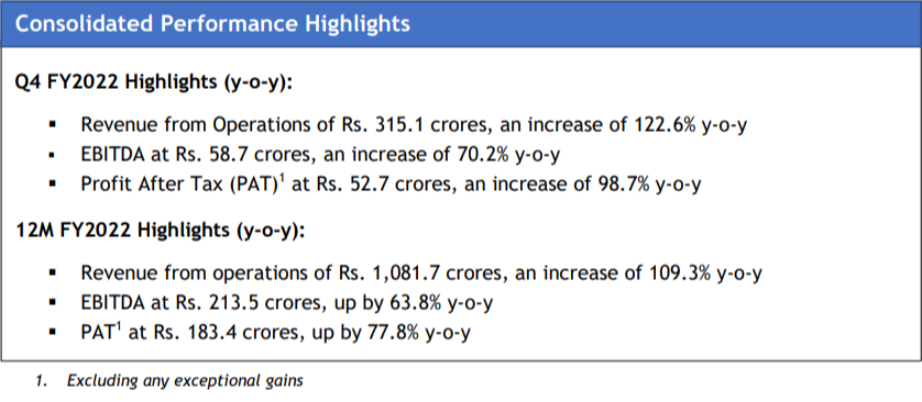 For 12M FY2022, consolidated revenue was at Rs. 1,081.7 crores, an increase of 109.3% y-o-y. EBITDA was at Rs. 213.5 crores, an increase of 63.8% y-o-y. PAT increased by 77.8% y-o-y to Rs. 183.4 crores and PAT margin stood at 16.4%.